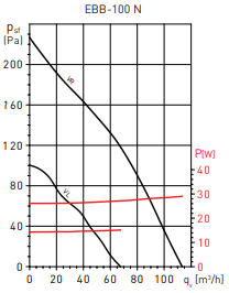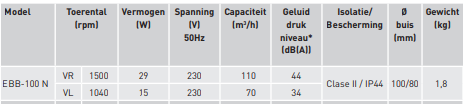 De EBB-100N ventilator is uitgevoerd in een witte kleur en heeft een capaciteit van 110 m³ per uur in de hoogstand en 70 m³ per uur in de laagstand. De badkamer- en toiletventilator is voorzien van twee filters die de lucht aan de zijkant aanzuigen en een centrifugale waaier met voorovergebogen schoepen, waardoor deze uitstekende prestaties levert. Om ervoor te zorgen dat de ventilator optimaal functioneert, is het van essentieel belang dat er voldoende luchttoevoer is, zodat er genoeg frisse lucht is om de afgevoerde hoeveelheid lucht te vervangen. Dit kan bijvoorbeeld worden bereikt door een spleet onder de toegangsdeur aan te brengen of een rooster in de toegangsdeur te plaatsen.